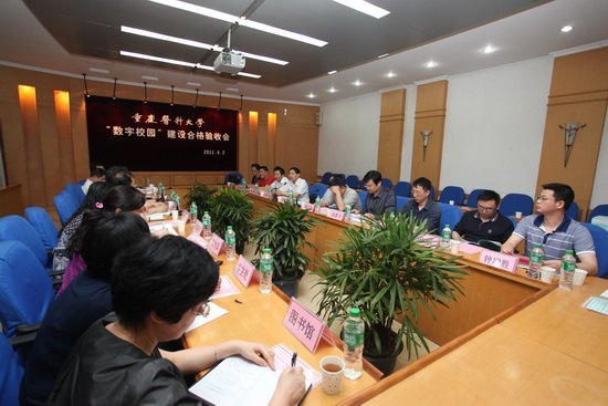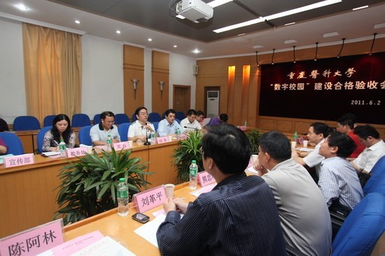 根据中共重庆市委办公厅、重庆市人民政府办公厅《关于建设“五个校园”的意见》(渝委办发〔2009〕50号),重庆市教育委员会、重庆市经济和信息化委员会、重庆市科学技术委员会《关于印发重庆市“数字校园”建设实施方案的通知》(渝教科〔2009〕27号)文件精神, 6月2日,重庆市“数字校园”建设领导小组对重庆医科大学“数字校园”建设进行合格验收。重庆市教委副巡视员程明亮,“数字校园”建设领导小组办公室主任、市教委科学技术和学位研究生处处长干勤,“数字校园”建设领导小组办公室副主任、市科委社会发展处处长许志鹏,“数字校园”建设领导小组办公室副主任、市教育信息技术与装备中心副主任傅鹰,市经信委社会信息化处正处级调研员彭远华,重庆大学、西南大学、重庆师范大学、重庆邮电大学、重庆工商大学等高校专家,重庆医科大学校长助理田杰以及相关部门负责人参加了合格验收会。
