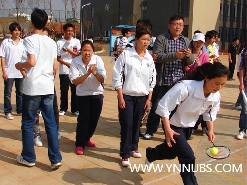 为使大学生有一个良好的精神风貌投入到学习生活中,培养大学生坚强的意志和团队协作力,丰富校园生活,云南师范大学商学院于3月29日—30日在杨林校区开展为期两天的趣味运动会。3月29日14:00,杨林校区趣味运动会开幕式在教学楼广场如期举行,学院理事会执行理事刘学民,院长王昆来,党委书记章秉纯,副院长、杨林校区管委会主任聂建、党委副书记、杨林校区管委会主任何福全、副院长梁正卿、财务总监童精明等领导,各职能部门领导、杨林校区所在院系总支书记、辅导员以及杨林校区2011级全体同学参加了开幕式。开幕式上,副院长聂建致开幕词,她希望同学们能够本着“阳光运动、快乐你我”的理念,在运动会中赛出风格、赛出水平,尊重裁判、尊重观众。同时也要求裁判及工作人员认证负责、准确公正,做好比赛的服务工作。随后王昆来院长宣布趣味运动会正式开始。此次趣味运动会分为集体项目和个人项目两个部分。29日当天举行的集体比赛项目有齐心协力,集体拔河比赛,30米×40人迎面接力及球拍托球接力四项。赛场上,运动员展示着各自的风采,为自己的队伍争夺着荣誉,赛场外此起彼伏的助威呐喊声将比赛推至高潮。3月30日举行的趣味运动主要以个人项目为主,个人项目比赛由垫排球比赛,计时跳绳,吹乒乓球,夹玻璃球,定点投篮,滚铁环,颠球比赛组成。最终,哪一学院将摘取本次趣味运动会的团体总分奖桂冠?让我们拭目以待!预祝各院系参赛同学取得优异成绩!