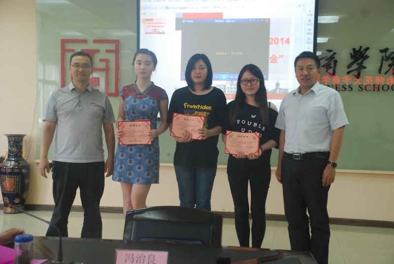 5月16日下午,商学院“昆明律政奖学金”2014年度颁奖典礼在慧宇楼102会议室隆重举行。昆明律政培训学校杜彦能校长,云南师范大学商学院王昆来校长、杜国海副院长,法学院冯治良院长、王雪副院长、谭艳书记等老师及法学院31名获奖学生参加了颁奖仪式。法学院院长冯治良教授主持了仪式。仪式上,王昆来校长首先宣读授奖决定。接着,律政学校杜彦能校长发言,他说从2012年11月份起,昆明律政培训学校与云南师范大学商学院法学院签订了合作协议,针对法学院英语过四六级的学生设立“昆明律政奖学金”,此项奖学金已发放两年,惠及70多名学生,充分表明了律政学校和法学院对同学们的关心和支持。同时他希望同学们能更加努力学习,全面发展,将来为学校、社会发展做出贡献。云南师范大学商学院杜副校长也发表讲话。他指出,此项奖学金的设立和发放充分体现了法学院“以学生为中心”的理念,为学校培养具有国际视野的高素质法律人才注入了全新动力,也体现了律政学校为学生服务、为社会服务,积极承担社会责任的办学理念。促进了法学院多元激励机制的形成,也让法学院广大学生在学校温馨的帮助和关照下能更快更好的成长成才。接着,法学院获奖学生代表发表感言,对两校领导、老师们表示感谢,认为学院多元激励机制的建立不仅给同学们带来了生活上的帮助,还从精神上给予了巨大的激励。在谈了自己的学习经历和体会后,他表示会和广大同学一样更加努力学习,在人生道路上积极进取。随后,法学院王雪副院长发表讲话,她说目前全国法学专业学生多达60多万,社会对法学人才需求较大,但普遍存在学生就业难、企业招工难的问题,而法学院一直致力于解决这一难题,对学生培养不仅注重专业素质培养,更加注重结合社会需求来提升学生实践能力。学院设立多项奖学金建立全面完整的奖励制度为学生提供多方面的支持,希望广大学生珍惜学习机会,努力全面提升各方面实力,成为社会需要的卓越法律人才。 最后,律政学校杜校长、云南师范大学商学院王校长、杜副校长等领导为31名获奖学生颁发了奖状、奖金,所有参加仪式的师生在文渊楼前合影留念后,颁奖式在欢声笑语中圆满结束。