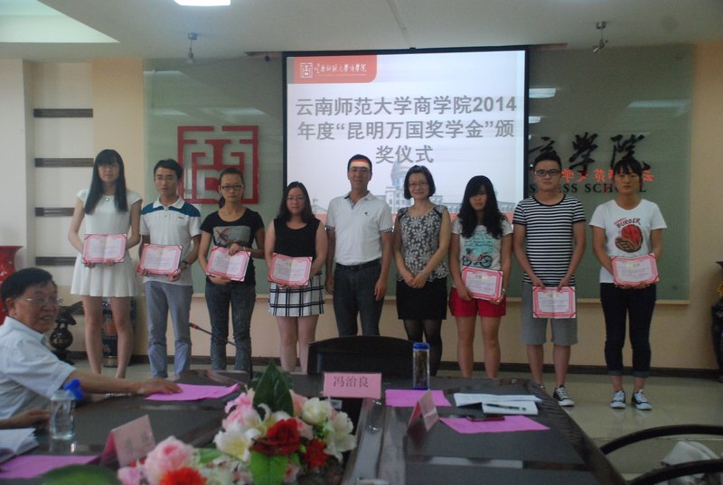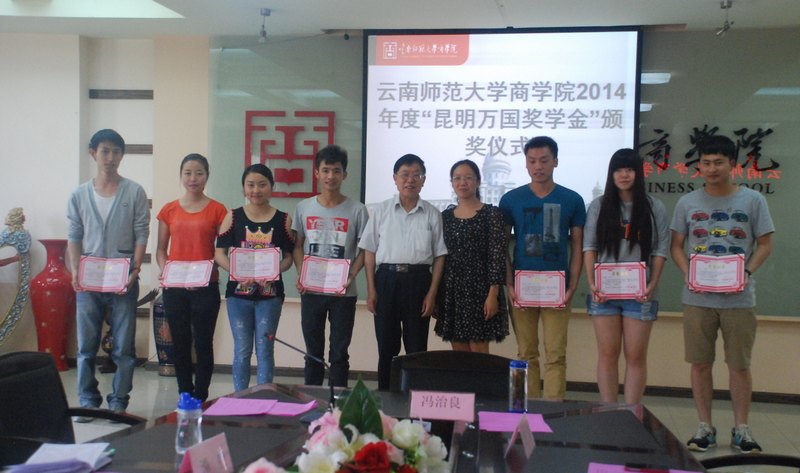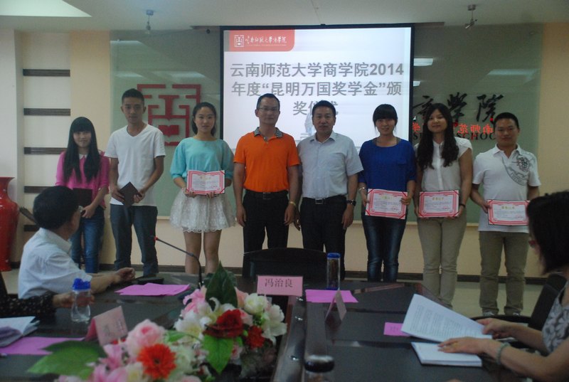 2014年度商学院“昆明万国奖学金”颁奖典礼于5月16日下午在慧宇楼102会议室隆重举行。昆明五华万国新起点学校周科校长、云南师范大学商学院校长王昆来、副校长杜国海,法学院院长冯治良、副院长王雪、党总支书记谭艳等教师代表和获奖学生代表参加此次颁奖仪式。法院院院长冯治良主持了颁奖典礼。云南师范大学商学院“昆明万国奖学金”是由昆明五华万国新起点培训学校出资设立。包括司法考试特别奖、学习优秀奖、学生工作优秀奖三类奖项。典礼上,王昆来校长首先宣读了授奖决定,并诚挚祝贺获奖同学。周科校长在典礼上讲到:“希望后学发现自身潜力,坚定信心、志存高远、脚踏实地、不断进取”,同时,周校长希望同学们把握好十八大的良好机遇,努力学习知识,成为祖国未来建设的可靠力量”。杜国海副校长代表学校发言,杜副校长首先以“成为了学霸和别人的孩子”祝贺所有获奖学生;紧接着讲了三句感谢的话,第一感谢周科校长在“做事业的同时不忘记作为企业家的社会责任。”其次感谢在以冯院长为代表的广大法学院师生励精图治、积极进取,取得了学院优异的发展态势,最后感谢一线教职工的辛劳工作,为学生成长成才提供了良好的服务。最后杜副校长希望同学们“记住母校、记住感恩,在知识和才干增长的同时永葆一颗感恩和平和之心。”最后,周科校长、云南师范大学商学院王校长、杜副校长、冯院长、王副院长等领导为获奖学生代表颁发了奖状、奖金,所有参加仪式的师生在文渊楼前合影留念后,颁奖仪式在欢声笑语中圆满结束。