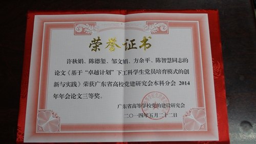 此次年会上,举行了年会优秀论文评奖。我院建筑与土木工程系党总支许秋娟、陈德玺、邹文娟、方余平、陈智慧同志撰写的论文《关于“卓越计划”下工科学生党员培育模式的创新与实践》获得年会论文三等奖。