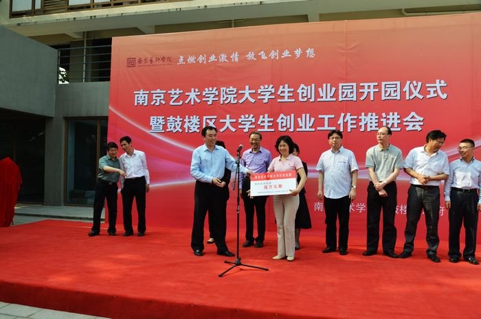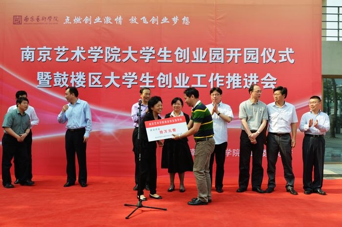 开园仪式上,南京市人社局副局长江萍为南艺颁发了“就业创业指导站建设基金”十万元,鼓楼区委常委、副区长周文中为南艺颁发了“大学生创业园建园奖励资金”五万元。