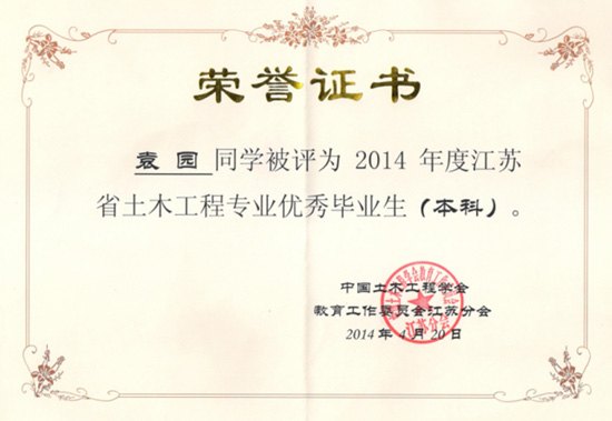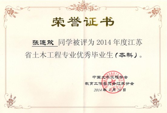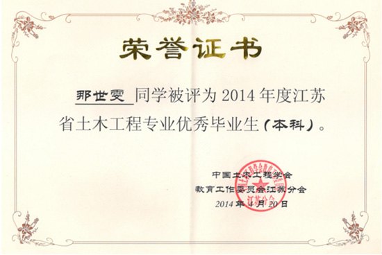据悉,“江苏省土木工程专业优秀毕业生”评选是中国土木工程学会教育工作委员会江苏分会每年工作会议暨教学改革研讨会议的重要活动之一,参评的学校包含了江苏省内所有设立土木工程专业的本、专科高校,由高校土木工程教育专家对参加评选的土木工程专业2014届应届毕业生进行评审。