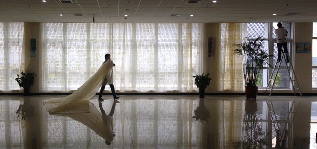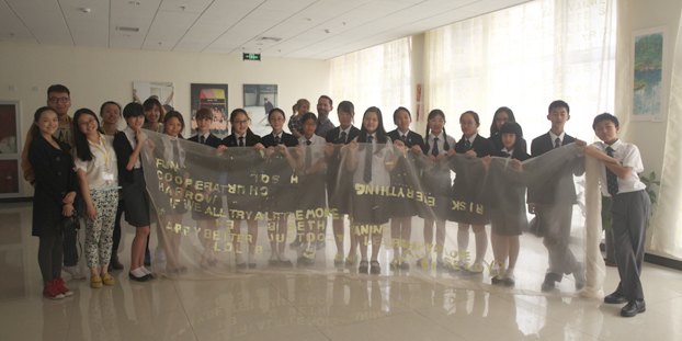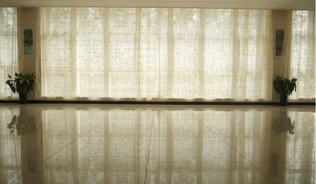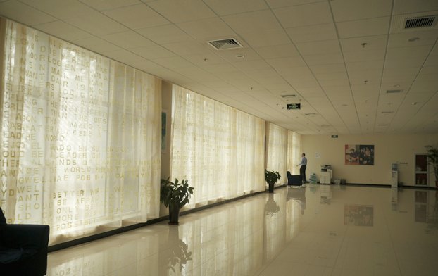 我对材料的选择实验了很久,最终选择2060冰纱,这种材质不易皱,不易脏,而且亲切、透明,更有意思的是它单纯得没有任何纹理的材质,但是当我把两层冰纱叠加在一起,在阳光下便产生了光晕感和飘忽不定的感觉。文字的呈现,我选择用印章将字母一个一个印刻上去,因为印章在中国古代代表的是权威、力量。这种肯定的方式以冰纱这种捉摸不定的材质为载体,体现学生们可变和多样的特性。而把全校师生对校训的理解放在一起,意在让他们反思人与人,人与历史的关系。