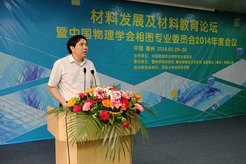 本网讯 5月29日-30日,由中国物理学会相图专业委员会主办,惠州学院和惠州高新锡业有限公司共同承办的“材料发展及材料教育论坛暨中国物理学相图专业委员会2014年度会议”在惠州学院顺利召开。中国物理学会相图专业委员会32位专家代表参会,学院党委书记杨海涛和副院长刘国栋等院领导出席开幕式。会议由电子科学系主要负责人主持。