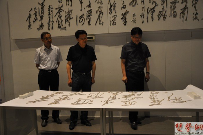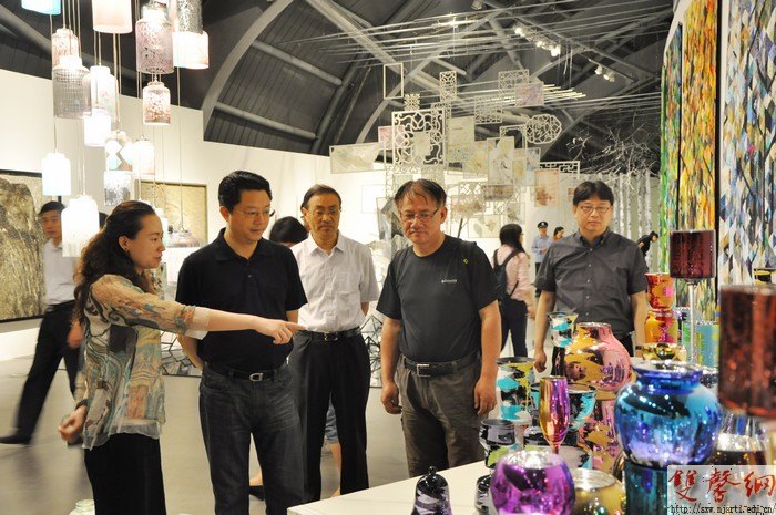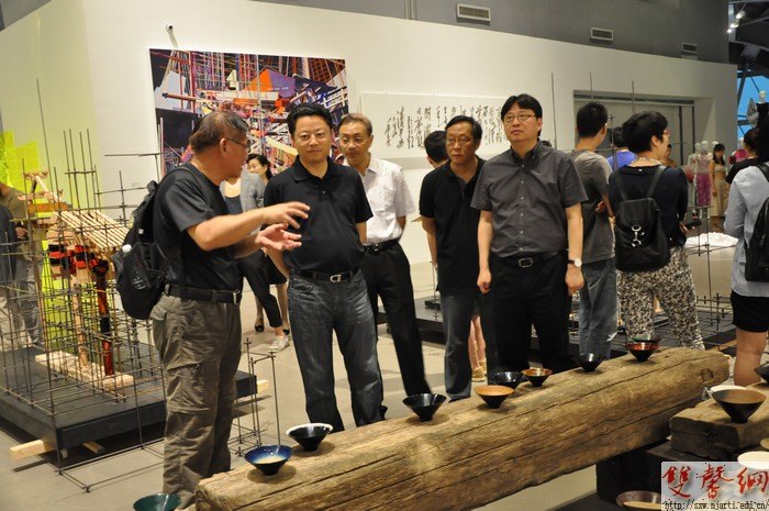 杨卫泽一行在校党委书记管向群、院长刘伟冬的陪同下,依次参观了设计学院480名毕业生设计的1200余件作品。在《三生万物——源·三生万物——相·三生万物——色》玻璃艺术作品前,杨书记仔细地询问该作品的制作手法与生成手段,当得知该作品是与社会企业共同合作研发的,杨卫泽非常赞同这种创意设计与企业工艺技术相结合,校企共赢的做法;《南海一号》陶瓷装置作品以宋代海上丝绸之路运输陶瓷与丝绸的沉船为创作背景,并生动地将制陶术与舞蹈完美结合,杨卫泽在《南海一号》作品前驻足近20分钟来观看现场学生的表演。考察过程中,杨卫泽对于展出的首饰、纺织品、玻璃器具、家居产品、环境艺术设计以及视觉信息设计等作品给予了高度评价,并对“实验_2014”设计学院毕业生作品展的人气、社会影响力给予了高度赞扬及肯定。