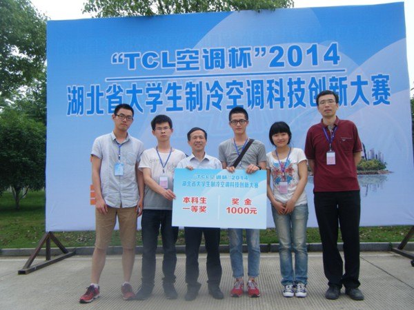本网讯(通讯员叶晓江)5月31日,由湖北省制冷学会、湖北省空调制冷行业协会、武汉市制冷学会、武汉市土木建筑学会联合主办的2014湖北省大学生制冷空调科技创新大赛在武汉商学院举行。理学院11级热动专业学生张艺雪、陈时、陈震和李嵘峥在副校级领导吴锋教授和指导教师叶晓江教授的带领下参加了比赛,其参赛作品为“新型多功能节能换气窗”。参赛队员在现场竞答和创新设计作品答辩阶段表现出色,最终获得本届科技创新大赛一等奖。