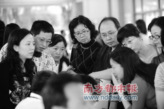 昨日在深圳中学大堂等待的家长一边焦急,一边咨询更多关于孩子考试的情况。