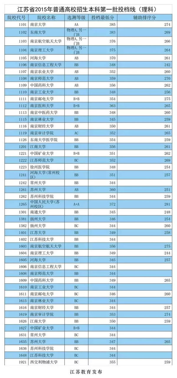 招生信息 » 江苏省2015年高校招生本科第一批次录取投档线发布