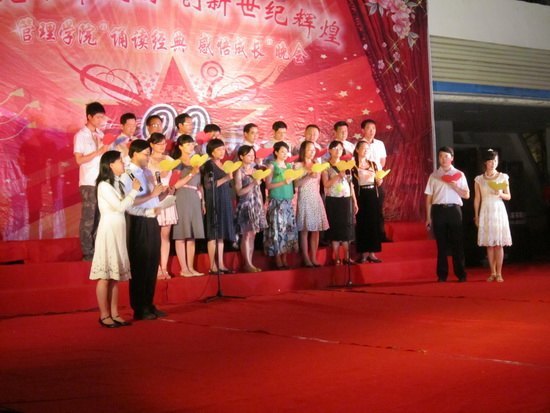 陌上花香,桃熏竹染;沐四月春光,诵红色经典。为迎接中国共产党90周年华诞,于4月28日晚上7点,在韵博体育馆,管理学院主办、第八学办承办了一场主题为“诵读经典 感悟人生”的晚会。