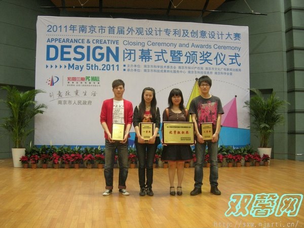 5月5日下午,在南京市文化艺术中心隆重举行的2011年南京市首届外观设计专利与创意设计大赛闭幕式暨颁奖仪式上,南京艺术学院工业设计学院师生将包含一等奖在内的5个奖项揽入囊中,一等奖获得者工业设计学院研究生马佳佳作为唯一的获奖者代表在颁奖仪式上发表获奖感言。同时,南京艺术学院获得“优秀组织奖”。