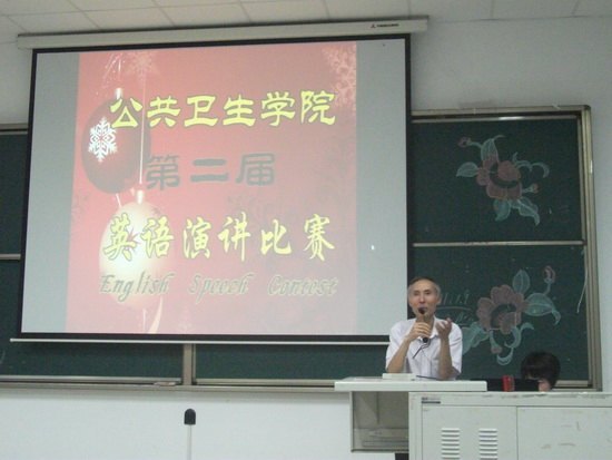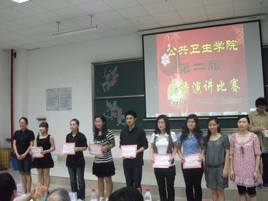 为适应国家改革开放和高等教育发展的要求,提高同学们的英语交流水平,2011年5月8日晚6:30,公共卫生学院在缙云校区A3-1401教室举行了第二届英语演讲比赛,经过激烈的初赛从各班级角逐出10位优秀同学参加本次比赛。公共卫生学院副书记许小冲、汪洋教授、赵勇副教授、夏茵茵、叶孟良、刘琴老师和第五学办陈敏副主任等出席了本次比赛。