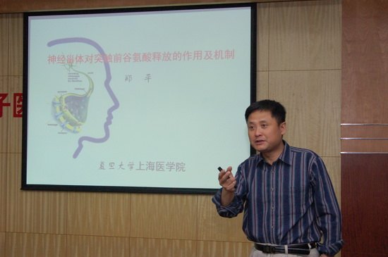 郑平教授以“神经甾体对突触前谷氨酸释放的调节作用和机制”为题,以自身为例。通过讲学内容,向大家展示了如何凝练科研方向,培养科研思维,让参加报告会的老师和研究生受益匪浅。讲座大约90分钟,整个学术厅座无虚席。与会师生对郑平教授讲学的内容,表示了极大的兴趣,纷纷与郑平教授积极交流。
