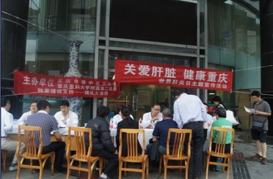 2011年5月19日是第四个世界肝炎日。为普及肝病防治知识,让更多的人提高关注肝病意识,5月14日上午,附二院与渝中区卫生局、腾讯大渝网在医院外科大楼门口联合举办了“关爱肝脏 健康重庆”大型义诊活动,向市民宣传爱肝护肝常识,讲解肝病防治知识和养生保健常识等,受到市民欢迎。