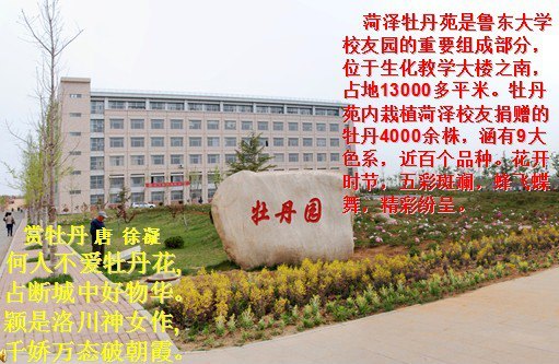 去年岁寒时节,菏泽校友赠送母校九大色系、100多个品种的4000株牡丹栽种在生化教学实验大楼前。一棵棵毫不起眼的小苗,经历了一个严冬的风雪洗礼,如今沐浴着春风雨露的滋润,竟恣意地竞相绽放起来,开的那样奔放,那样鲜艳,那样斑斓,那样娇媚……