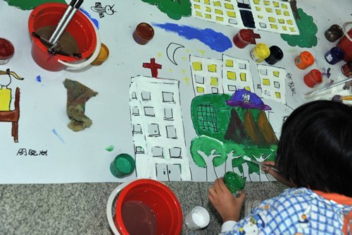 湘雅校区关工委顾问常显宜宣布活动开始,110名小朋友立即在画布上开始了他们的创作。他们拿起手中的画笔,把他们对世界的认识及对美的感受尽情描绘,以表达对党、对社会主义新生活的热爱和对美好未来的憧憬。跟随着孩子纯真的感性认识,我们被带入了一个多彩的童话世界。党旗、阳光、生命构成了一幅幅生动的画面:有的展示了医疗队奔赴抗震救灾前线的画面;有的体现了关爱动物、关爱生命的温情;有的表达了在党的关怀下茁壮成长的主题;还有很多环保方面的题材,让大人们深受启发。骨科护士长成湘红的女儿陈佳欣画出了繁忙的护理工作情形,并说长大后要像妈妈一样做护士长,惹得关工委的领导哈哈大笑。
