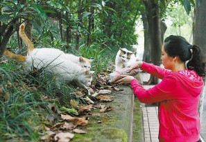 前日,记者走进西南政法大学沙坪坝校区,正好看见该校后勤办集团的工作人员顾洁端着猫粮,在喂体育馆附近的几只流浪猫。