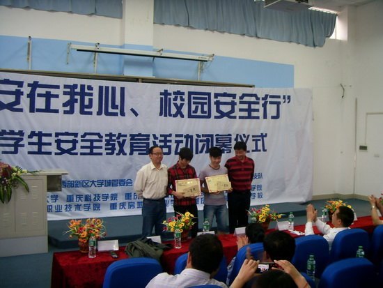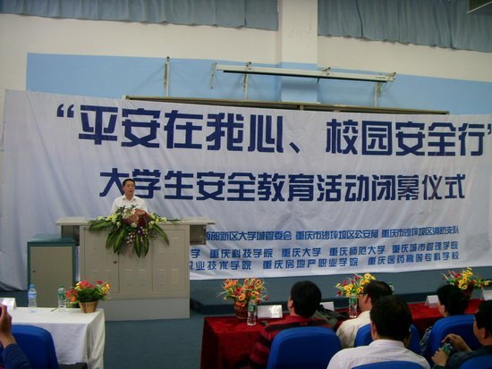 由重庆市沙坪坝区公安分局、消防支队、重庆大学城管委会主办,重庆医科大学承办的大学生安全教育活动决赛暨闭幕式于2011年5月25日下午在重庆医科大学缙云校区举行。参加本次活动的领导有沙区西部新城管委会刘副书记,重庆医科大学副校长兼缙云校区管委会主任邓世雄教授、管委会周平远副主任、保卫处刘刚副处长、学生处杨华仁副处长、校团委龚棣书记以及沙区公安分局领导和大学城有关高校保卫部门领导。