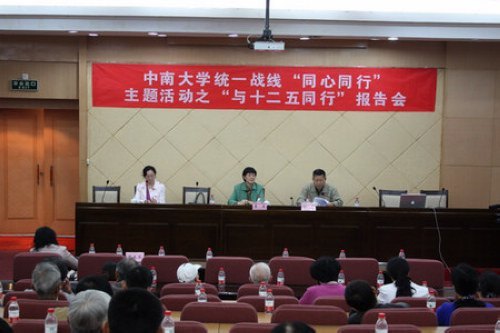 5月24日下午,校党委统战部统一战线“同心同行”之“与十二五同行”主题报告会在校本部升华楼101举行。全国政协常委、民革中央常委、省侨联主席、中南大学社会主义学院院长曹亚和校党委发展与规划部部长湛毅青应邀为中南大学统一战线人士解读“十二五”,校党委常委副书记徐慧出席并作重要讲话。校各民主党派基层组织、无党派人士、侨联、台联、少数民族联谊小组等统一战线代表参加了会议。报告会由校党委统战部部长龙大为主持。