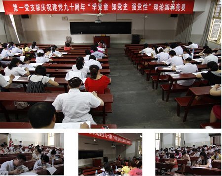 5月20日下午,一场特殊的“考试”在医院一教学楼一教室举行,紧张的气氛使得那沙沙的写字声显得分外大,原来,第一党支部的全体党员、入党积极分子正在这里举行党史知识竞赛。竞赛以闭卷笔试为主要形式,分单选题、多选题和主观问答题,竞赛内容主要包括党的基本理论知识、“三个代表”、科学发展观、创先争优等基本知识,问卷既全面回顾了党的90年光辉历程,又对十七大以来党的理论创新和理论成果给予了高度关注。此外,还别出心裁的考察了党员同志在新的形势下如何立足本职岗位开展创先争优,实现岗位大作为等实际问题。