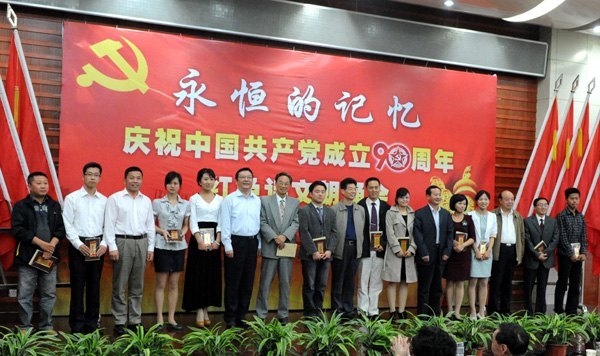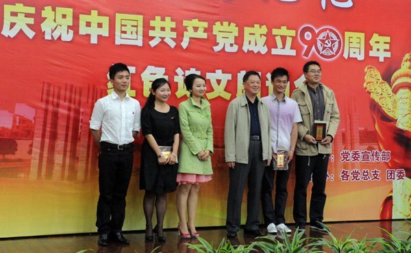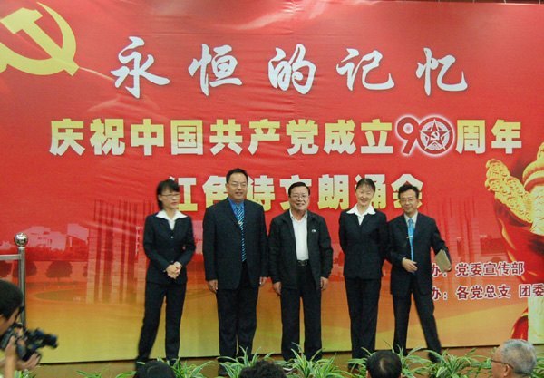5月25日下午,黄山学院“永恒的记忆—庆祝建党90周年” 教职工红色诗文朗诵会在图书馆二楼报告厅举行。校党委书记汪良发、院长汪建利、党委副书记李家祥、副院长徐成钢、纪委书记吴邦贵、副院长樊嘉禄、副院长胡家俊出席朗诵会并为获奖选手颁奖。