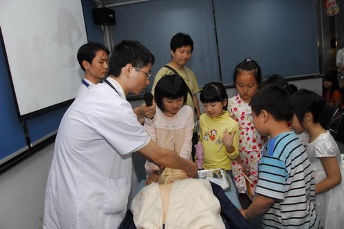 上午9点30分,医院社会开放日活动室内坐满了前来参加活动的小朋友。医院急诊科张宏亮医生正在为他们进行“意外伤害健康教育”的知识讲座。“发现有人中暑了怎么办?”张医生问道。“应该把他抬到通风处”“应该让他多喝水”“应该打120”……小朋友们争先恐后地回答。在半个小时的讲座中,张医生介绍了最常见的意外伤害(包括交通意外、跌落伤、动物咬伤、溺水、食物中毒等事情的预防与处理等)的预防措施以及急救方法。急诊科贺志飙医生给小朋友们模拟了心肺复苏、现场包扎的操作方法。不等讲座结束,小朋友们便急不可耐地围到单架床边上,有模有样地给模拟人进行“心脏按压”、“人工呼吸”、“伤口包扎”……现场气氛十分活跃。