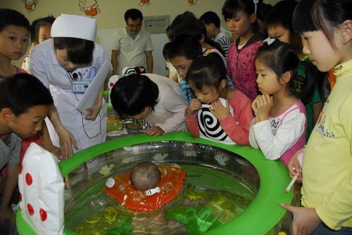 “我是从哪儿来的?”很多家长面临小孩这种问题时都要费尽“心机”来回答。上午10点,26位小朋友在工作人员的引领下,来到产科、新生儿科参观,通过图表,直观形象地了解胎儿发育过程,参观新生儿游泳及抚触按摩,了解生命的奥秘,感受母爱的崇高和伟大。“我想问他,到底会不会游泳啊?”一位小朋友看到在尽情游动的新生儿好奇地问道。