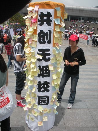 在厚德广场,八大块图文并茂喷绘的连排展板,“果断拒绝香烟、真心呵护健康、共创无烟校园”的大型横幅,食堂LED屏幕“共创无烟校园、享受健康生活”的公益广告,精心组织的控烟有奖知识竞答,两米高的巨型香烟道具以及穿着白色可签名T恤的流动身影等在广场上形成了一道靓丽的风景线。预防医学协会的成员使用小广播开展“吸烟有害健康,共创无烟校园”的宣传。师生们有的参与控烟有奖知识竞答,有的写下自己的感受或寄语,有的在大型横幅上签名,表达他们对“共创无烟校园”的支持。