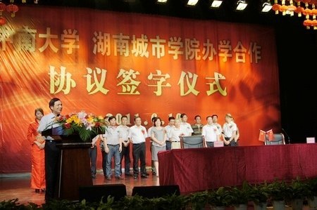 6月10日下午,中南大学与湖南城市学院办学合作协议签字仪式在益阳市举行。省教育厅副厅长申纪云、高教处处长唐利斌,益阳市副市长黄东红,中南大学校长黄伯云、常务副校长黄健柏、党委副书记徐建军,校党委常委、学校办公室主任高山,校党委规划与发展部、研究生院、本科生院、科学研究部、人事处、土木工程学院等有关单位负责人,及湖南城市学院的领导和师生代表500余人共同出席了签字仪式。