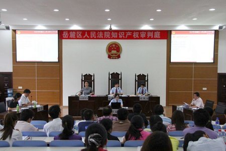 6月14日,法学院模拟法庭,长沙市岳麓区人民法院知识产权庭公开审理一起商标权纠纷案件。合议庭由审判长柳晓寒、审判员陈科科、以及人民陪审员中南大学法学院教授何炼红组成。中南大学200余名法学院师生到庭听审。