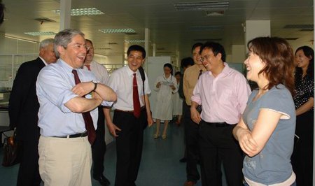 6月14日,法国总统萨科奇先生的医学研究与卫生参赞、巴黎笛卡尔大学小儿遗传学专家、让·弗雷扎尔医学遗传学中心主任Arnold Munnich博士经法国驻中国大使馆介绍专程到访中南大学,认真系统地参观了中南大学医学遗传学国家重点实验室。张灼华副校长代表学校亲切地会见了外宾,并全程陪同了外宾的参观、主持了双方的合作会谈。陪同Arnold Munnich来访的还有法国驻北京大使馆科技专员Andre Villalonga先生及法国驻武汉总领事馆科技专员Jaques Fleck先生。