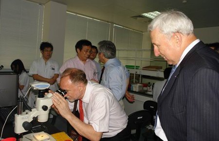 外宾们对中南大学医学遗传学国家重点实验室的设置、所取得的成就及目前正在开展的研究和工作感到惊喜,对开展双方合作表示了浓厚的兴趣。Munnich教授表示:我们的实验室也是世界上最好的实验室之一,每年在<<Nature>>等杂志上要发表25—30篇文章,我们两家实验室能很好地开展合作。会谈中,对方提到了双方可以在合作研究、学生交换及申请法方研究项目和奖学金等方面开展合作。经过讨论,双方初步同意将在帕金森病等疾病的研究、共同举办研讨会及学校与学校之间三个层面开展合作。Munnich教授还多次热情洋溢地邀请张灼华副校长等适时访问法国。