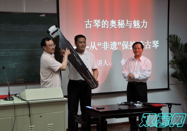 人文学院院长刘承华教授为马维衡先生颁发了聘书,南风古琴社总经理单卫林先生赠送给人文学院一架马维衡先生亲手制作的古琴“霜钟”,院长刘承华教授为其颁发了收藏证书。仪式结束后,马维衡先生结合自己多年学琴、斫琴的经历,向在场的师生作了题为:“古琴的奥秘与魅力——从非遗保护谈古琴”的讲座,马老师深入浅出的讲解让大家受益匪浅,特别是马先生现场弹奏古琴名曲《良宵引》,《忆故人》以及广陵代表曲目《平沙落雁》,精湛的琴艺与“霜钟”完美结合,让在场的每一位享受了一场古琴盛宴。 (人文学院)