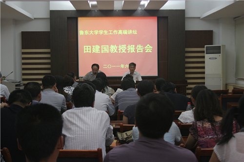 下午,在1号办公楼第二会议室,田建国为鲁东大学学生工作人员作了题为《高校德育创新》的报告。他从“德育”和“创新”两个概念入手,深入分析了21世纪大学生德育工作面临的新环境、新挑战。他指出,德育创新首先要树立整体优化思想;二是要研究德育的规律,总结德育经验,分析德育问题,探索德育规律,正确认识大学生是一个健康成长的群体、时代环境塑造的群体、需要加强理论教育的群体、需要引导发展的群体、需要推进自我教育的群体;三是要树立高校德育核心理念,确立以人为本的教育思想和创新教育的观念;四是要创新教育观念,从教育的对象、本质、目标、使命、组织形式等方面进行创新;五是要努力提高素质,坚定理想信念,加强做人修养、树立人文关怀理念、善于团结合作、增强事业心。