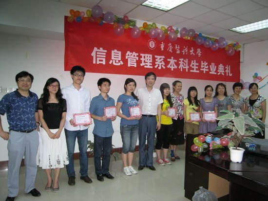 “今日,我以重医为荣;明日,重医以我而骄傲”。6月23日,信息管理系2011届本科生毕业典礼暨优秀毕业论文表扬大会在体育馆五楼会议室隆重实行。重庆医科大学副校长谢鹏教授、信息管理系主任罗丽娟、系副主任赵文龙、信息管理系全体教师、第八学办年级教师及2011届21名毕业生从事了毕业典礼。