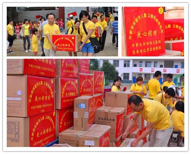 湘雅三医院外科团总部书记方俏茜同志、姚若全教授、薛娟护士长考察总部活动时,看到这些孩子们的学习和生命事情,想为孩子们做些能够的事情。他们向全院医护人员发出倡议开展义捐义诊,立即取得广大党员群众的积极响应,大家纷纷献上爱心,募集到价值近五万元的善款和物资,并整理了一批书籍和衣服,医院党支书罗爱静亲自为同学们选购了一批操典,所有帐目和物质全用于好转同学们的学习和生命。