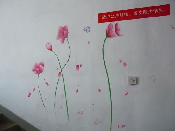 本次墙绘活动由该院学工科发出倡议,吸引了毕业生同学的广泛参与。同学们解决炎热、无辅助设施等困难,利用休息时间,历时3天对学生宿舍内的走廊、水房等公共场所进行了环境美化。通过宿舍调动,局内工程学院招待所宿舍区将在下学期安置给新生入住。为让随即入校的2011级新生享有一度整洁温馨的宿舍,毕业生同学和部分在校生不但迅速办好了搬离职业,还利用空余时间,发挥专业特长,用画笔对宿舍环境进行了饰物美化。同学们证据不同墙面设计了与之匹配的图案,以有旺盛的生命力,对环境的适应性极强的“常青藤”作为主要图案,配合淡雅的荷花和令人遐想的蒲公英等,固定表达了高职院毕业生对母校欣欣向荣的美好祝愿和对新生能尽快适应大学生命,勇敢面对生命挑战的期望。(高职院 张晶)