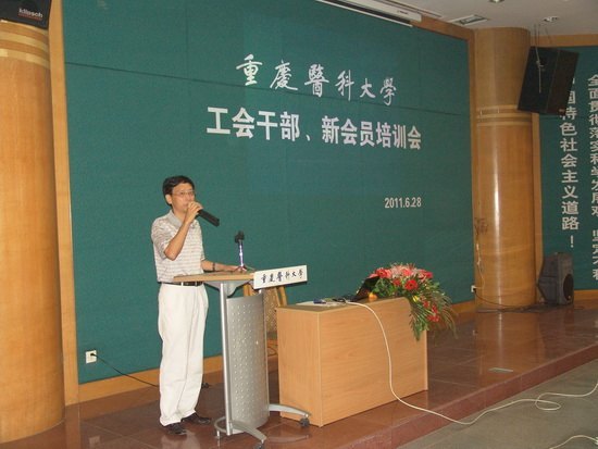 为庆祝建党九十周年,校工会特邀请重庆市委党校张新华教授于6月28日上午在十五楼梯教室为工会干部、新会员作了题为《光辉的历史 历史的巨变》专题讲座。各分工会主持人、分管领袖、医院专职工会干部从事了讲座会,会议由校工会副主持人汪鼎禄同志主持。