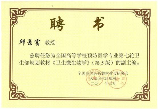 全国高等医药教材建设分析会、人民清洁塔斯社聘请公共清洁学院邱景富教授担任全国高等学校预防医学专业第五轮清洁部计划教材《清洁微生物学》第五版副主编;聘请钟晓妮教授为《清洁统计学》编委、涂白杰教授为《职业清洁与职业医学》编委、王宏副教授为《婴儿少年人清洁学》编委,代兴碧副教授为《卫理化学实验指导》编委。