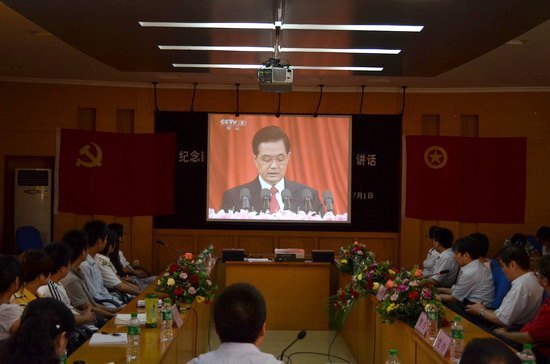 7月1日上午,学校机构部分学生骨干在行政楼2楼大会议室集中收看中央庆祝中国共产党成立90周年大会电视机实况直播,并举行了纪念建党90周年暨学习总书记“七一”讲话实质学生骨干座谈会。校党支书吴小翎、团省委副书记常晓勇、校长助理田杰及团省委学校部、统战部、市学联,学校党办、校办、机构部、宣传部、学工部、团委等负责同志与同学们一起收看并从事了座谈会。