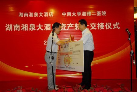 7月15日上午10点,湖南湘泉大酒店财产转让交接礼仪在原湘泉大酒店实行,湘雅二医院正式收购该酒店。收购方湘雅二医院将把该酒店改建为专科医院,进一步好转就医环境,缓解老百姓就医就医难事。交接礼仪由副院长陈晋东主持。
