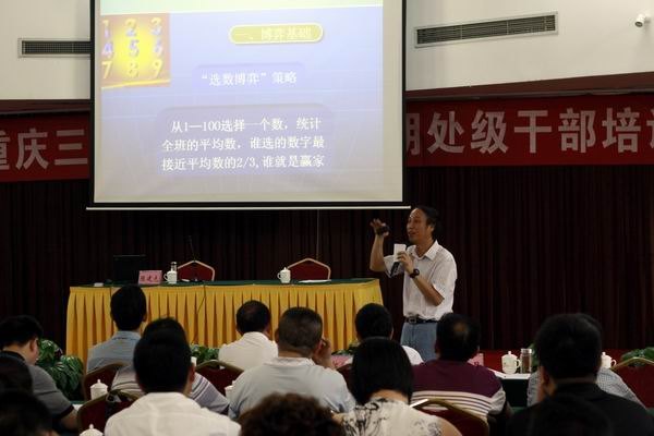 继孙校长的讲座后,重庆市委党校陈建先教授为大家讲课了《博弈论与计策思考》,陈教授的讲座别具一格,妙趣横生,他以选数游戏、硬币游戏和数目字游戏与大家互动,将精湛的博弈理念融会在游戏之中,让大家在一片轻松愉悦的氛围中领悟到了作为一名干部在职业中如何换位思考、如何打造团队实质和如何理性地求得最佳等博弈观念。