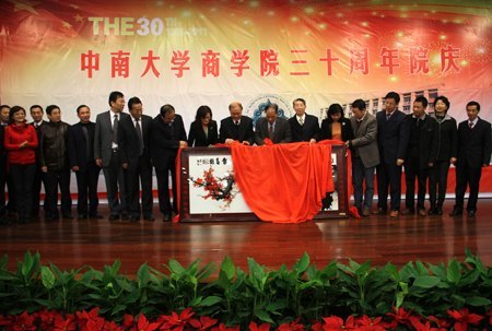 81级校友为学院30华诞送来了一幅春意盎然的湘绣——《报春图》,黄健柏、陈晓红等为此揭牌。此外,其他校友也捐赠了很多纪念品,并一一领取证书合影留念。同时,商学院教育发展基金成立,会议宣读了捐款单位名单。