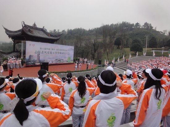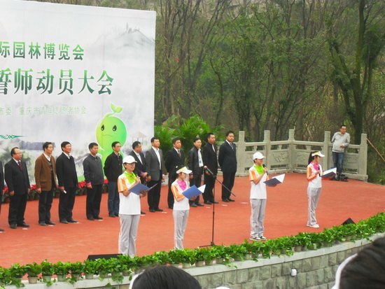 重庆医科大学志愿者作为唯一代表在誓师大会上领誓 园博园赋—外国语学院 杨帆 有客自长安出潼关,恰路经重庆,青山隐隐而市井连绵,江涛浩瀚而烟波相接。惟见白云之上,女者翩然而下;白浪之中,老者悄然而至。双双向客,拱手候安。长安客作揖还礼,赞曰:“千里为重,广大育庆,天生都会,地博嘉名。山雄莽苍苍,连湘黔,接川秦,纵横八万平方公里。水劲浩荡荡,出三峡,奔云梦,活跃三千一百万人。从中国西部崛起,挽长江上游挺秀,壮哉大山大水,美哉山城江城。天下大成之美。嘉木逢春而秀,浮云送影而凉。”女者曰:“十载兮盛会长相,九州兮胜地经常。受济南之幸,展渝秀之美。第八届中国国际园林花卉博览会,第一流重庆园博园必然一鸣惊人焉。”