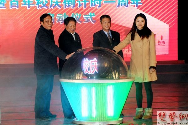 党委书记米如群、院长邹建平、教师代表李永清、学生代表方婷婷共同按下百年校庆倒计时一周年启动彩球
