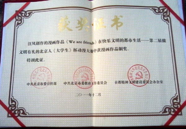 近日,快乐文明的都市生活——第二届做文明有礼的北京人《大学生杯》动漫大赛颁奖典礼在北京电影学院举行,黄山学院08动画学生汪凤创作的作品《We are friends》荣获漫画组铜奖,汪凤、史林妹合作的作品《我是谁?》荣获动画组优秀奖获奖,两位同学受邀参加了颁奖典礼。