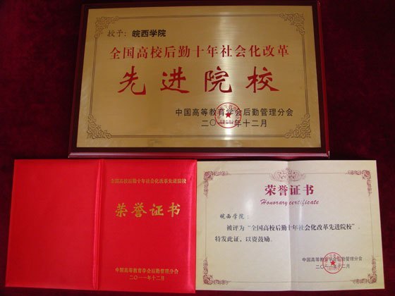 会上对获得全国高校后勤十年社会化改革先进院校和优秀后勤服务企业进行表彰。皖西学院被评为全国高校后勤十年社会化改革先进院校。