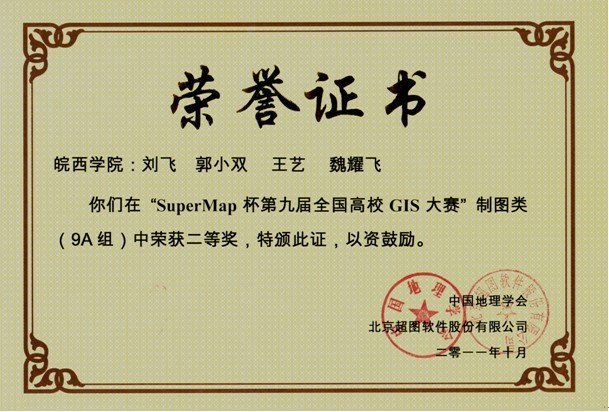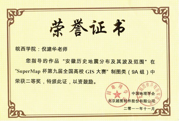 2011年11月26日,由中国地理学会主办的SuperMap杯第九届全国高校GIS大赛在北京林业大学隆重举行,经过激烈角逐,皖西学院2008级资源环境与城乡规划管理专业和地理科学专业的刘飞等同学的参赛作品《安徽历史地震分布及其波及范围》和《六安旅游及房价分布图》分别荣获制图组二等奖和优秀奖,同时王升堂教授和倪建华老师获得优秀指导老师奖。