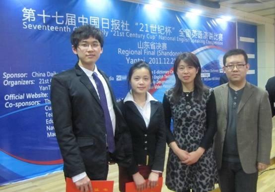 12月21日,由中国日报社主办、21世纪英文报系与烟台大学承办的第17届“21世纪杯”全国英语演讲比赛山东省决赛在烟台大学逸夫楼报告厅举行,来自山东省内多所高校的24名选手参加了此次比赛。比赛演讲主题为 “文化发展之路:多元与趋同之争”。鲁东大学校园选拔选手外国语学院2009级学生熊宗君和2010级学生孙世臻代表学校参加比赛并获得二等奖。 (外国语学院周兴华)