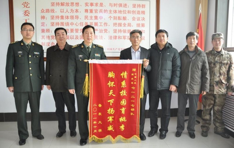 1月12日,在新春佳节即将到来之际,校党委副书记郑明珍在原武装保卫部(处)政委、后勤集团总公司总经理孙德新,武装保卫部(处)处长李景奎、政委高明福的陪同下,带着全校师生的拥军热情,到驻莱阳和福山某部队进行走访慰问,为部队官兵送去了节日的祝福和问候。驻莱阳和福山部队首长冯奕、王涛等热情接待了鲁东大学慰问团。